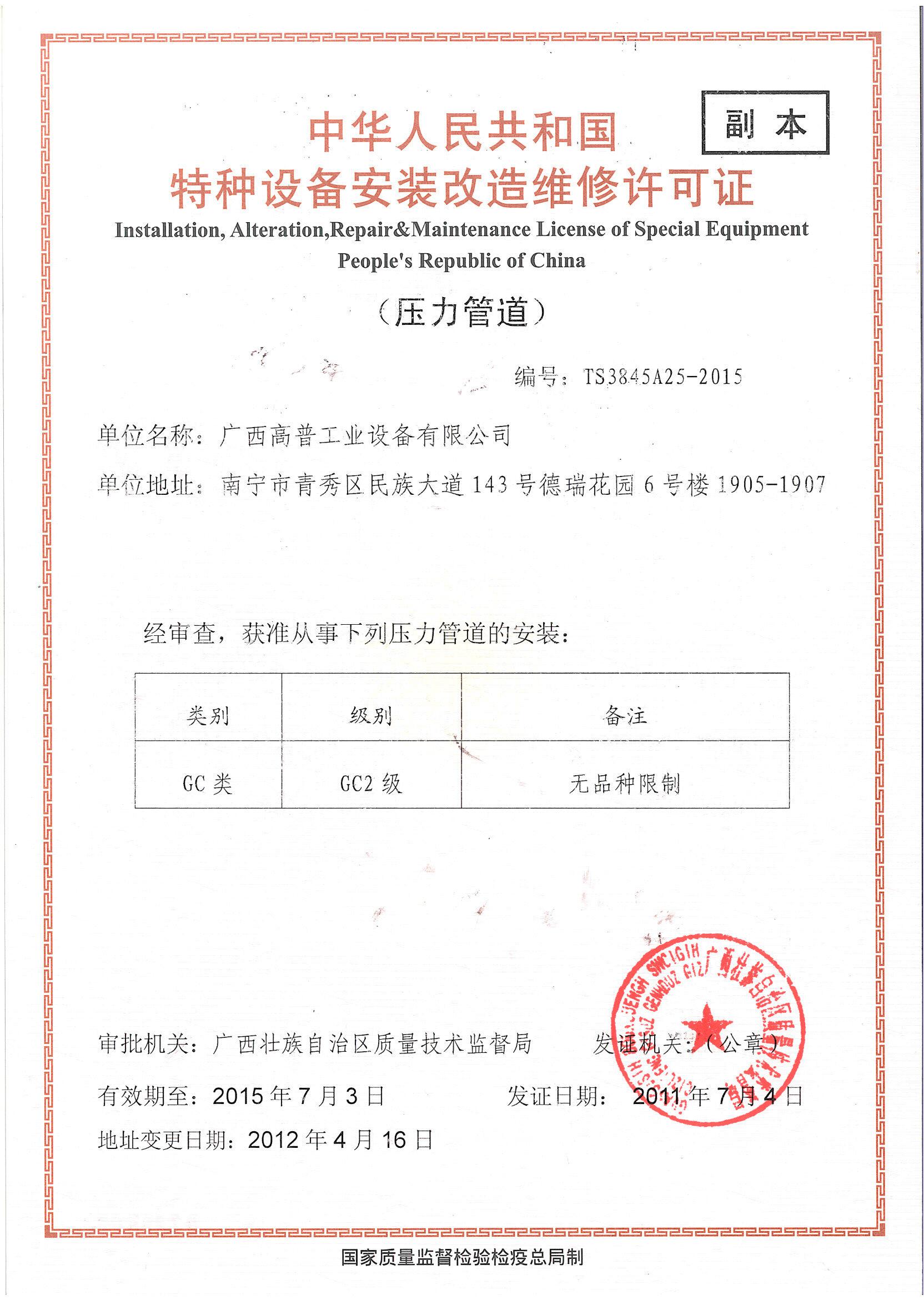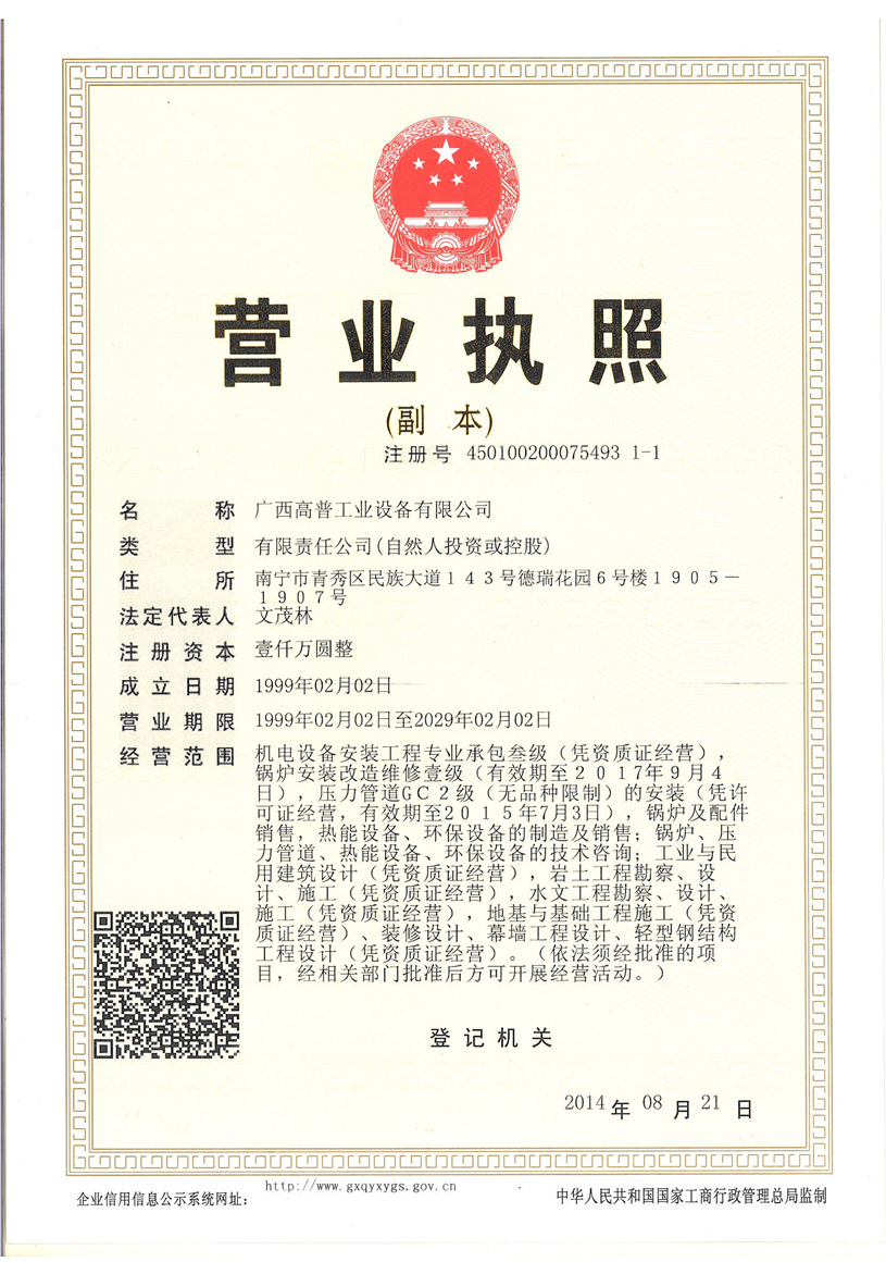 廣西高普工業設備有限公司的前身是南寧高普熱能設備有限公司,是一家成立于1998年,具有獨立企業法人資格的的有限責任公司。公司總部設在廣西首府南寧。在云南、宜賓等多處地方、地區設有辦事及分公司。 本公司是高新技術企業,持有國家技術監督局頒發的1級《特種設備安裝、改造、維修(鍋爐)》許可證,1級許可證是最高級別,可安裝、改造、維修任何形式、參數的鍋爐設備。并持有《壓力管道》安裝、改造維修許可證,1級《壓力容器》安裝、改造、維修,機電設備安裝工程專業承包3級等資質。 公司擁有雄厚的人力資源和技術裝備力量。在現有正式員工中,鍋爐及相關專業工程技術人員55名,其中高級工程師10名,工程師32名。持證焊工55名,持有合格項目七十多項次,項目中包含了一類鋼種和二類鋼種的各種形式的電弧焊及氬弧焊。無損檢測人員11人,Ⅲ級2人,II級9人,項目包括含常規四種探傷方法。機電設備安裝專業工程人員58人,撻有相關專業證書涵蓋40多項專業項目。其中:宜賓分司駐有員工108人,其中工程技術人員23人,高級工程師3人,工程師7人,助理工程師13人,持證焊工20人,II級無損檢測人員5人。 本公司多年專業從事鍋爐設備的安裝、改造、維修工作,擁有多名業內知名的鍋爐專家,有技術過硬的施工隊伍,在制糖行業、造紙、發電行業等領域,有良好的聲譽。..詳細
